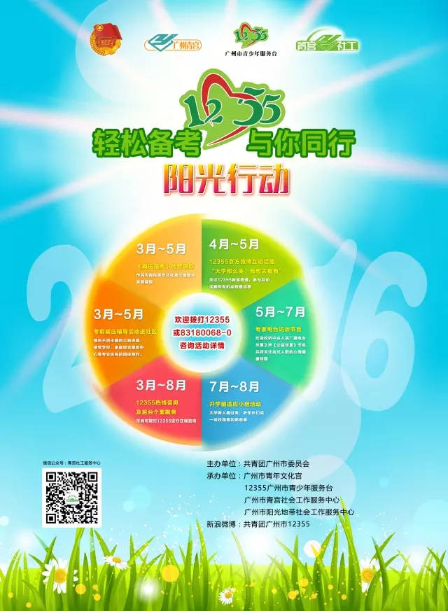 嘿,小伙伴们,一期一会的12355阳光行动又如约而至啦!今年,12355联合广州市青年文化宫推出的阳光行动将从3月一直持续到8月,快关注12355的官方微博,看看有没有适合你的菜吧! 新浪微博☞☞“共青团广州市12355”,关注后即可获取各阶段活动简介及报名参与方式。