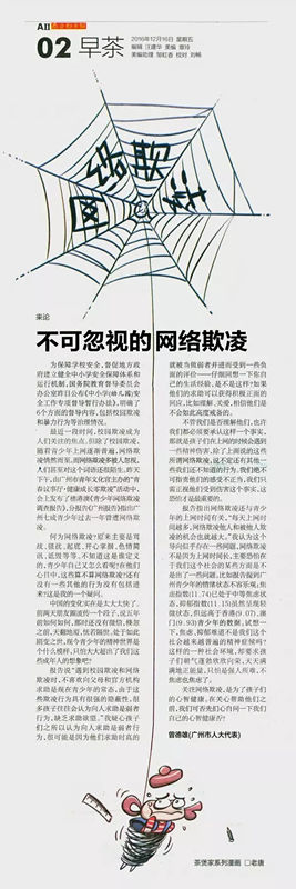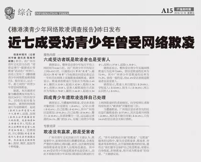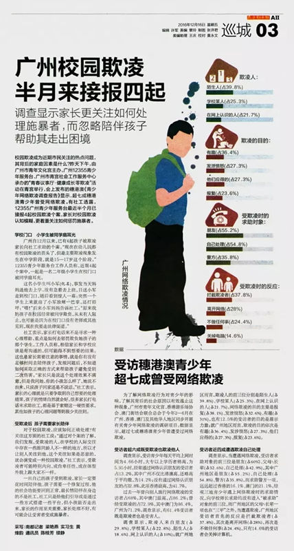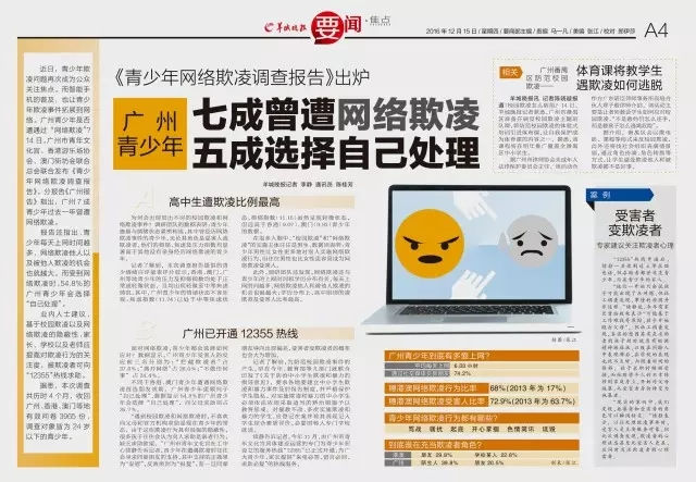 媒体报道 《青少年网络欺凌调查报告》的发布及“青春议事厅·健康成长零欺凌”活动均受到媒体广泛关注,南方日报、广州日报、羊城晚报、南方都市报、新快报、信息时报、广州电视台、广东电视台均作了详尽报道。