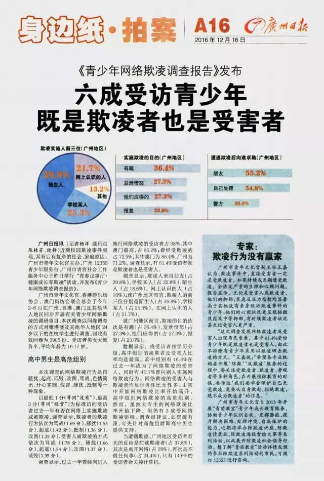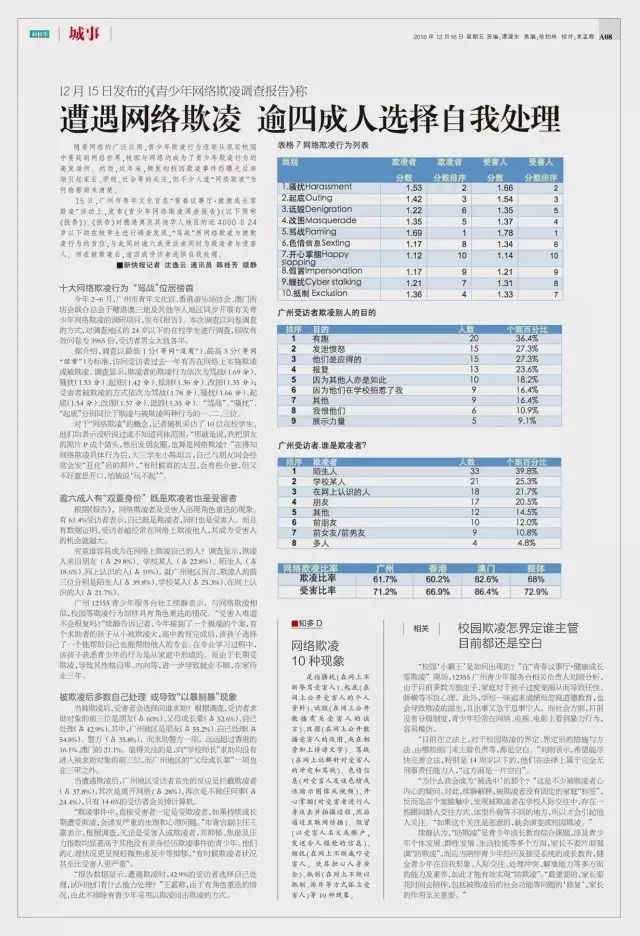 调查发现 过去一年,曾经向别人施行网络欺凌的受访者占68%,曾经受欺凌的占72.9%。 有61.4%受访者既是欺凌者也是受害人。 欺凌者的欺凌行为依次为骂战、骚扰、起底、抵制、改图。 网络欺凌的目的主要是报复、发涉愤怒、有趣,也有12.5%的受访者的目的是展示力量。就广州地区而言,欺凌的目的依次是有趣、发涉愤怒、他们应得的、报复。 欺凌人来自朋友、学校某人、陌生人;就广州地区而言,欺凌人的前三位分别是陌生人、学校某人、在网上认识的人。 当遭遇网络欺凌,求助对象的前三位是朋友、父母\长辈、自己处理,其中广州地区是朋友、自己处理、警方。 当遭遇欺凌,广州地区受访者首先的反应是拦截欺凌者,其次是离开网络,再次是不做任何事,只有14.6%的受访者会关掉计算机。 (了解调查报告详情,请点击文末的媒体报道)