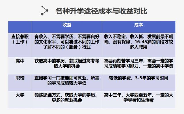 针对初二学生的具体情况,社工在班会上介绍初中毕业后的升学就业途径、各种途径的付出和收获,引导同学们结合自身的情况思考初中毕业后的升学途径。