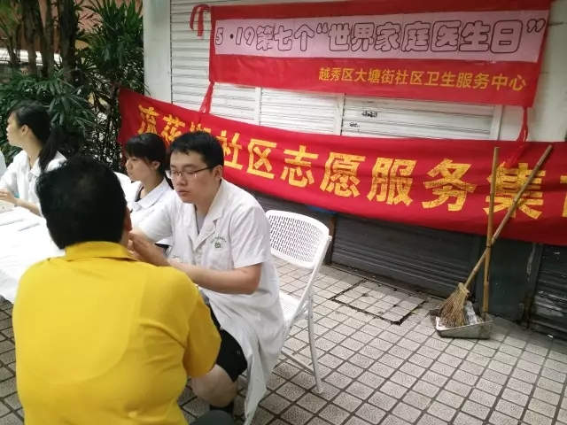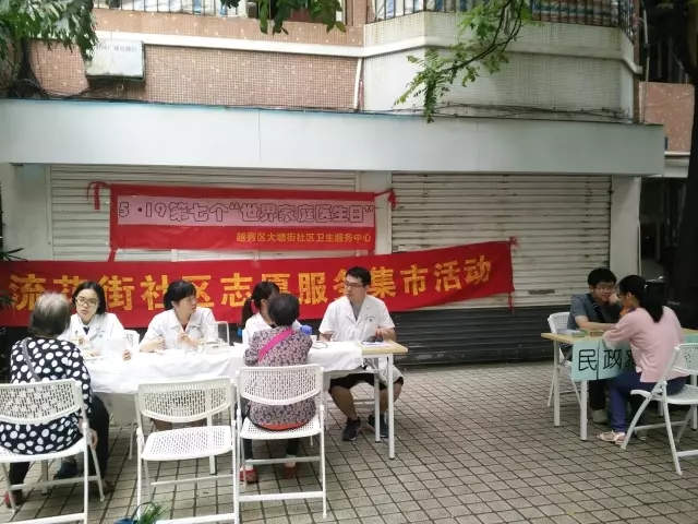 在健康义诊摊位,大塘街社区卫生服务中心的工作人员为居民们提供量血压和中医咨询服务,社区卫生服务中心的医生志愿者细心地写下血压结果给咨询的长者,并做出提醒。