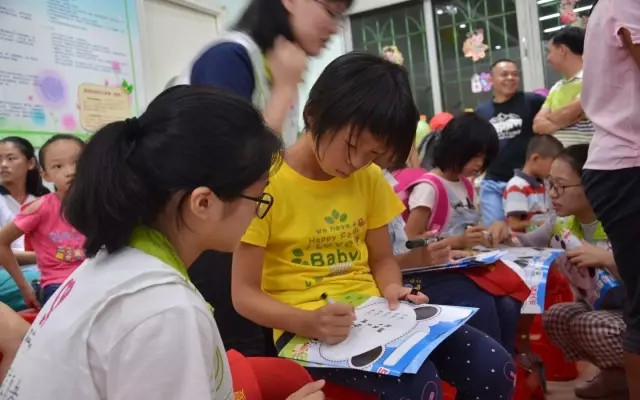 小朋友认真在卡上写上详细联系方式,让志愿者哥哥姐姐能及时联系自己。