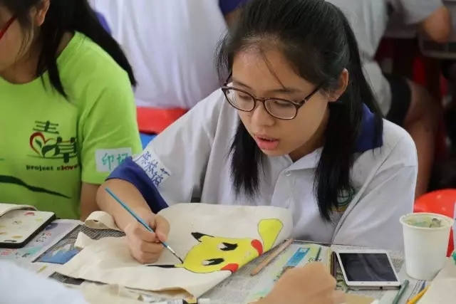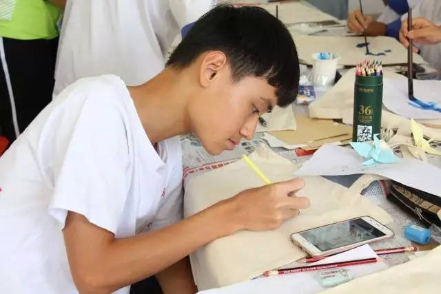 学生们在空白的书签、明信片和帆布袋上挥洒创意,尽情涂画diy,从找素材到构图、画画、上色、题字,不但锻炼了学生们的动手能力,还以另一种方式让他们表达自己。有同学说自己以前从没画过画,通过这次天马行空的创作,觉得画画很有趣,以后一定会继续画画。青少年潜能无限,也许一名大画家就这样诞生了。