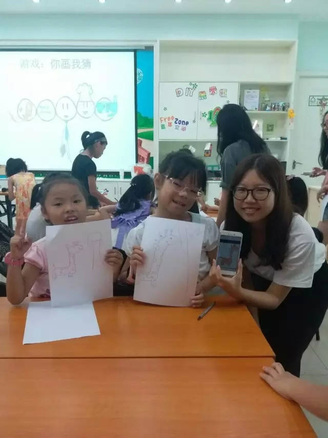 小朋友向志愿者姐姐展示自己的作品。 在游戏中学英语、学画画,就是这么快乐~