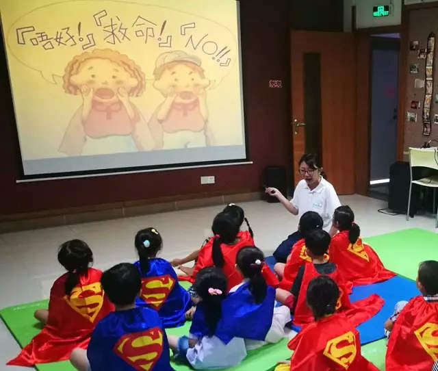 这群年龄在5-8岁之间的小学员很快就理解了“隐私部位”的含义,并将贴纸贴在了正确位置上。棒棒哒!随后,小学员们披上披风,化身“小超人”,对“陌生人过来抱你,让你感觉不舒服”“爸爸牵着你的手一起玩”等问题作出“yes or no”的判断,进行“情境式”的体验学习。