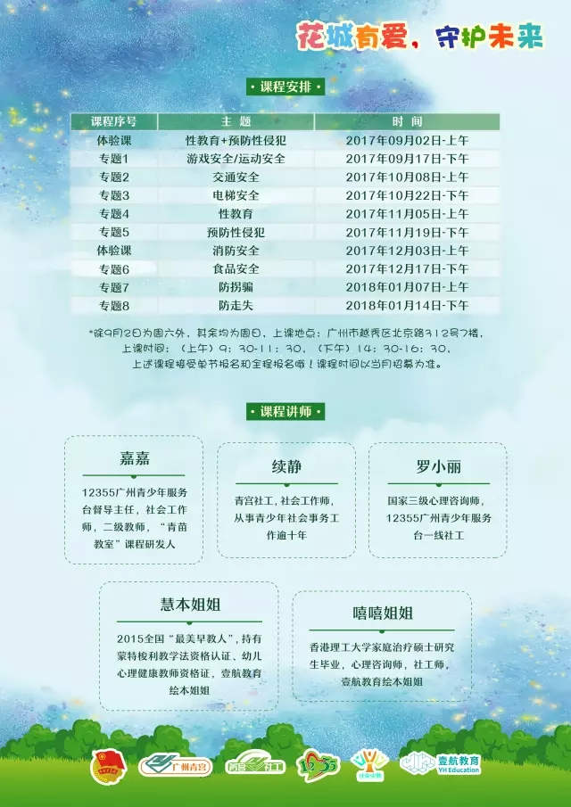 未成年人的安全教育不仅仅有“性教育&预防性侵犯”主题,父母们关心的游戏、交通、电梯、消防、食品、防拐骗、防走失等安全问题都将开课探讨,同样是运用浸入式、体验型的教育方式,让孩子快乐接受安全教育,父母也能学习与更新安全教育方法。
