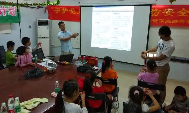 家长和小朋友们在学习如何结逃生绳索