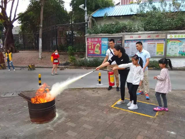 随着所有家庭顺利逃生到空地,消防员为参加者演示如何使用灭火器,随着现场阵阵的惊叹声响起,各个亲子家庭也纷纷体验了灭火器的使用。