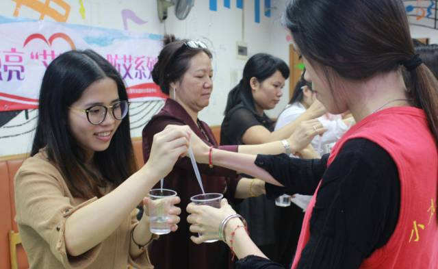 “水交换”游戏,通过趣味的化学实验模拟艾滋病传播,每一次的换水代表一次高危的传播行为。“咦!你的水那么红,原来你就是艾滋病病毒,我被你传播了,真不幸呀!”没错,艾滋病病毒传播的速度是非常快的,所以一定要提高警惕,避免感染哟!