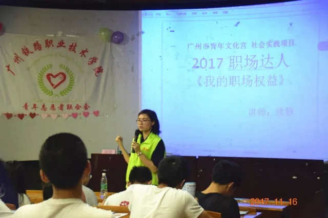 2017年11月20日,12355广州青少年服务台资深社工续静为各分部的同学们带来了一场《我的职场权益》讲座。同学们对劳动合同、试用期、加班补贴等关系到个人权益的事项很感兴趣。