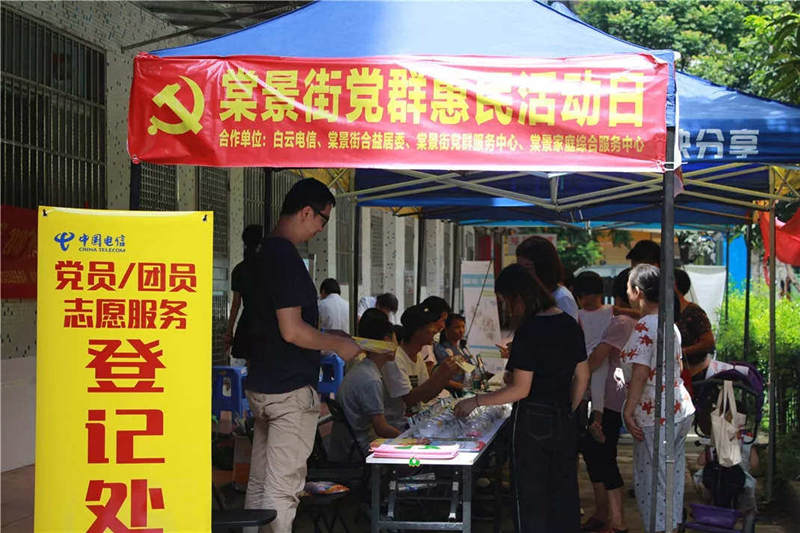 棠景街党群惠民活动日 为积极参与构建“营造共建共治共享”社会治理格局,同时贯彻落实“全国网络安全和信息化工作会议”精神,棠景街党群服务中心联合合益社区居委、棠景家庭综合服务中心、中国电信白云新市党支部,在合益社区开展为期三天(7.27-7.29)的社区志愿服务活动。
