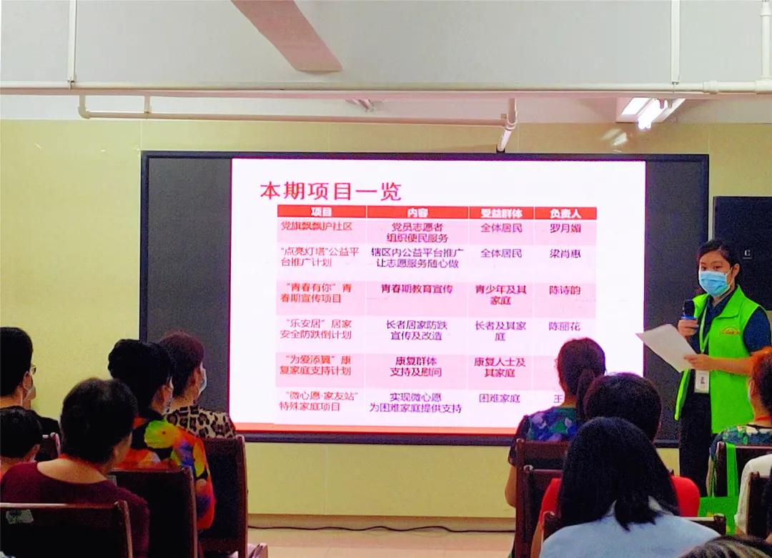 会议设置爱心同行环节,有意向承接项目的参会代表找到社工咨询项目的申请方法,同时欢迎所有居民、单位、企业、社区组织、党组织到社工站认领一份爱心,为社区公益助力!